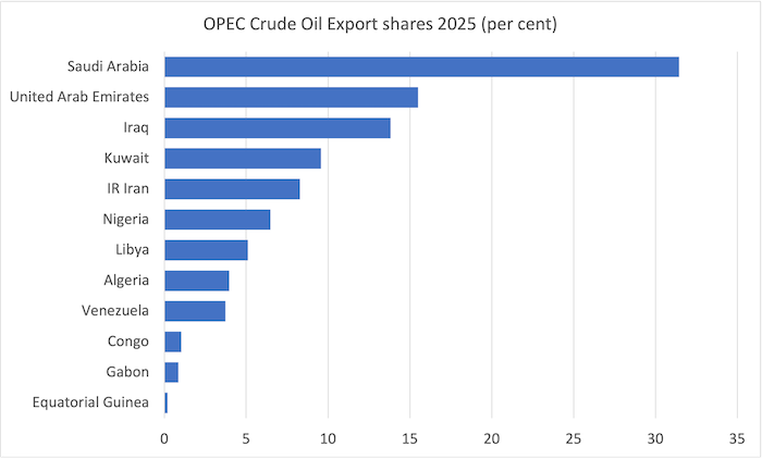 The next graph exhibits OPEC crude oil export shares in 2025.